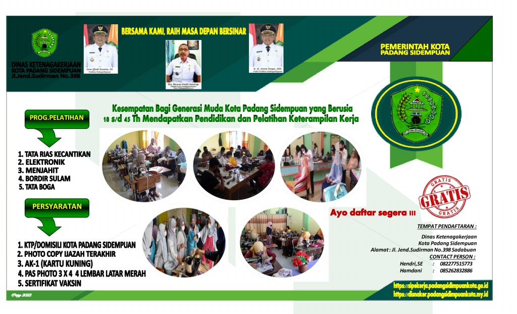 Sehubungan akan dilaksanakannya Pendidikan dan Pelatihan Keterampilan Bagi Pencari Kerja TA.2023, kepada mayarakat yang berdomisili khusus daerah Kota Padang Sidempuan yang mau Mendaftar Kejuruan Garmen Apparel Pelatihan Menjahit Pakaian Wanita Dewasa dengan durasi 240 JP (3 Paket) dan 320 JP (2 Paket) sebanyak 5 Paket,  Kejuruan Garmen Apparel Pembuatan Hiasan Busana Dengan Mesin Bordir Manual durasi 240 JP (1 Paket) dan 320 JP (1 Paket) sebanyak 2 Paket, Kejuruan Tata Kecantikan Pelatihan Tata Rias Kecantikan durasi 240 JP (3 Paket) dan 320 JP  (1 Paket) sebanyak 4 Paket, Kejuruan Elektronik Pelatihan Perbaikan Dasar Untuk Peralatan Listrik Rumah Tangga durasi 240 JP sebanyak 2 Paket dan untuk Kejuruan Tata Boga Program Pelatihan Pembuatan Roti dan Kue dengan durasi 120 JP sebanyak 8 Paket, dapat langsung daftar ke Dinas Ketenagakerjaan Kota Padang Sidempuan.